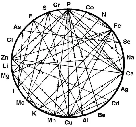 To read the wheel: If mineral A points to mineral B, it means that a lack of A or an interference with its metabolism (problem with how your body processes or body uses that mineral) can lead to problems with B.